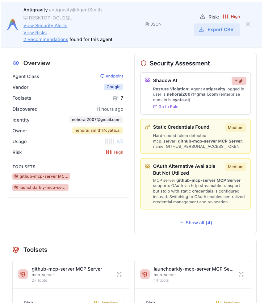 When we say Antigravity is already fully supported in Cyata for discovery and active posture management, we mean: